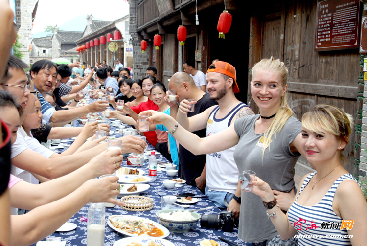 5月19日中午,前童古镇举行豆腐百家宴,长龙般的桌子沿老街摆放,不仅吸引了许多省内外游客,而且也吸引了德国、法国等国外游客。图为记者在古镇老街拍下的一组镜头。(左图:豆腐百家宴在古镇老街举行。右图:中外游客友好举杯。)