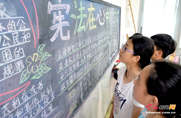 为加强青少年新宪法学习,弘扬宪法精神,增强他们的宪法意识,近日,前童司法所联合前童中学开展“学习新宪法,奋进新时代”为主题的黑板报评比活动,旨在通过评比,进一步营造广大师生学习新宪法的热潮。图为前童中学的几名学生在参观以新宪法宣传为主要内容的黑板报。