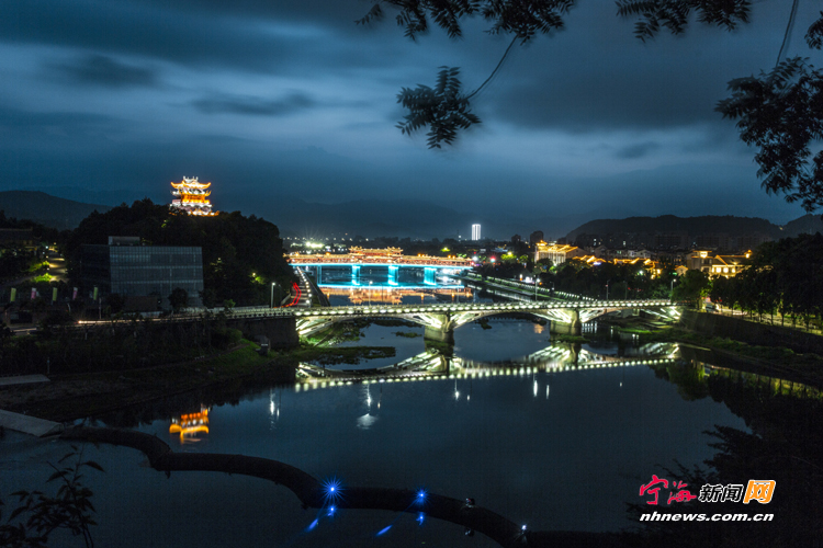 兴宁廊桥与飞凤山遥相呼应,南门外的夜晚流光溢彩。