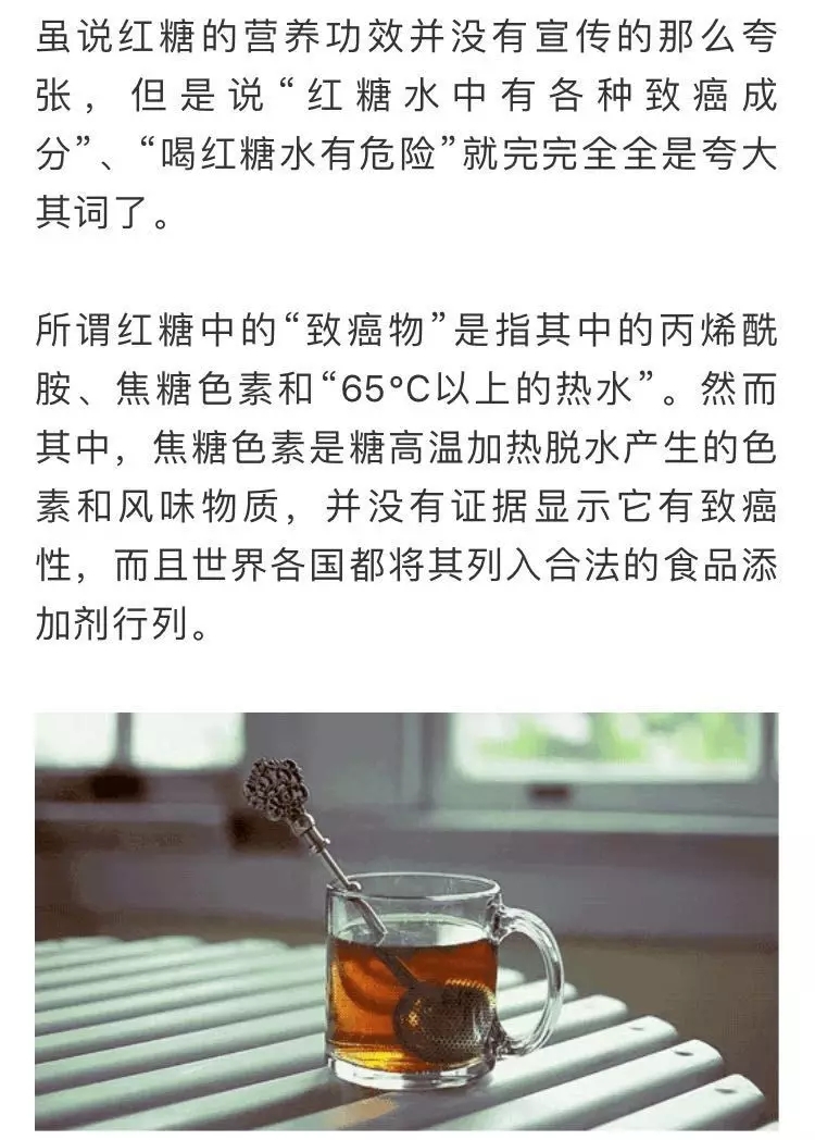 生理期对于痛经的妹子来说,简直是每个月最痛苦的时期。 ![]() 长辈总是苦口婆心地劝说,“喝点红糖水就好了”,就这样一代一代口口相传,形成了广泛的群众基础。 ![]() 但是,最近突然出现了“生理期喝红糖水是毫无意义的危险行为”的说法,文中声称红糖水中有各种致癌成分。对一直以来人们对红糖的推崇产生了强烈的冲击。 ![]() 那么,生理期喝红糖水究竟有没有用?喝红糖水是不是真的有危险?今天就详细的和大家说一说。