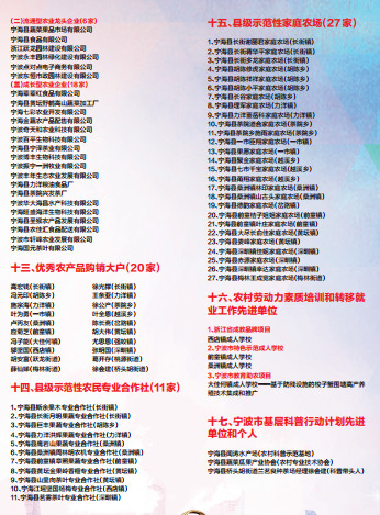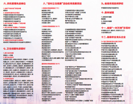 2018年,宁海县被评为全国主要农作物全程机械化示范县、全省农村垃圾分类处理工作优胜县、省级现代生态循环农业整建制推进县、省级畜牧业绿色发展示范县、宁波市农村“三居”专项行动优秀单位、宁波市农村公厕改造优秀单位。