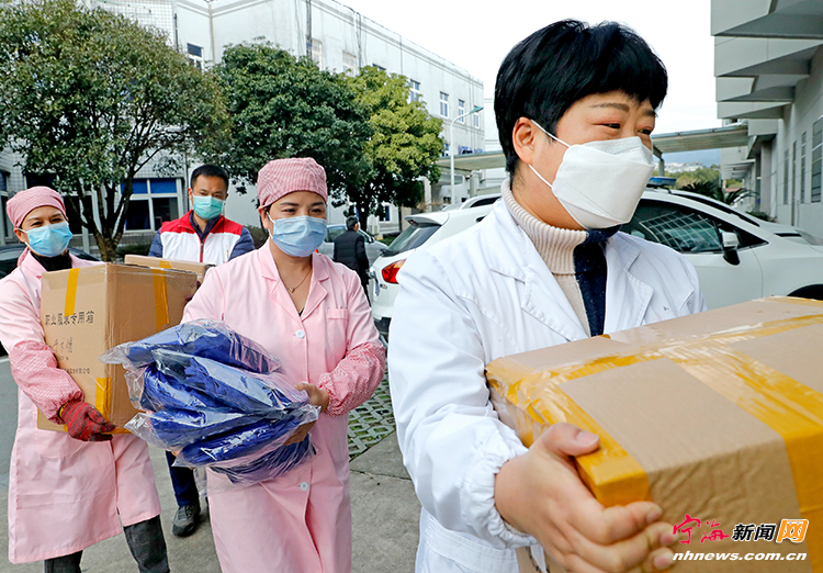 前日下午,宁海迪美斯服装厂厂长陈春芬把价值8万多元的1800个手术帽、95件护士服和225件手术服捐赠给县红十字会,并与红十字会志愿者一起,分别把这批定向医疗物资送到县第一医院、第二医院、中医院、妇幼保健院和岔路卫生院等地。 (记者李江林通讯员华建平摄)
