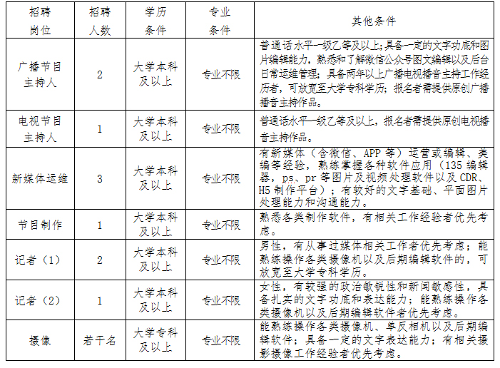 3、节目制作岗位:采取专业技能测试与面试相结合的方式进行。