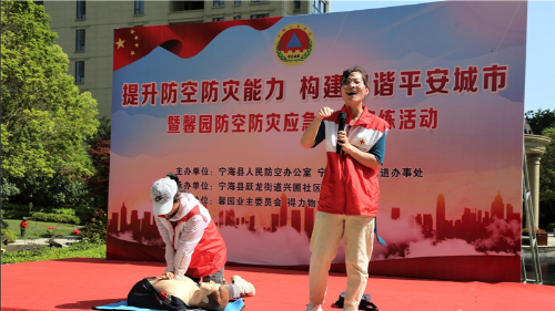 近日,宁海县人防办会同宁海县跃龙街道兴圃社区开展“提升防空防灾能力、构建和谐平安城市”为主题的应急疏散演练活动。演习期间,馨园小区300多名居民在听到警报声后,在引导员带领下有序地从楼梯汇集到地面集合点,并撤离到小区人防工程。人防工程内配备了医务人员为居民提供心理疏导,也配备了充足的物资。当日还开展了溺水急救、心肺复苏等急救知识培训。红字会的教师们现场示范心肺复苏的操作流程,并邀请居民现场操作演练。通过本次活动,不仅增强了居民的人防意识,也提高了居民自救互救的技能。