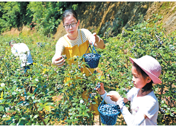 近日,市民游客正在梅林街道梅北村皂浦自然村的呱呱飞生态农场采摘蓝莓。一颗颗乌紫的蓝莓挂满枝头,掩映在翠绿的枝叶中,十分诱人。由于上半年雨水适中,今年蓝莓的产量和质量均好于往年,线上线下订单较多,经济效益明显。据悉,该农场还种有火龙果、红美人柑橘等,水果成熟季节,吸引了不少游客自驾游采摘,带动了当地农民增收致富。