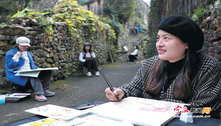 近日,嘉兴南湖区40多名美术家自发组团来到宁海,在桥头胡街道双林村、强蛟镇下渔村等地开展为期3天的写生活动,他们以“湖海相会,大美宁海”为主题,描绘出宁海优美的自然风光、独特的乡村风情和艺术振兴乡村成果。图为11日19日上午,美术家们正在双林村小巷里写生。