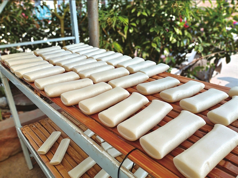 等年糕花出锅了,大人们会拿木棍捣碎和搅拌。年糕经过机器预设的口子出来,大伙儿又纷纷帮忙切年糕、晾年糕。这时,主人家总会拿出准备好的豆酥糖、榨菜包,热情地将冒着热气的年糕送到大家手中。