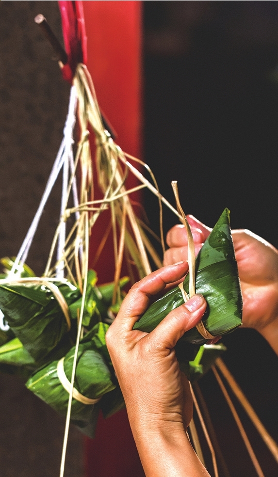 包粽子既是力气活,也需要技巧,拿来小粽叶叠在一起,双手一旋,将粽叶折成一个圆锥,一手托粽叶,一手抓糯米,然后把粽叶翻折过来,把糯米盖住。之后拿起绳子,一端用牙齿咬住,另一端握在手上,在粽子周围上下左右绕几圈,将粽叶紧紧地捆住,包住糯米,打个结,一只粽子马上就扼好了,有棱有角,严严实实,不会漏出糯米。粽子一般都是纯糯米的,也有人依据喜好,加入番薯干、红枣、豆沙等馅料,间或也有咸肉粽。