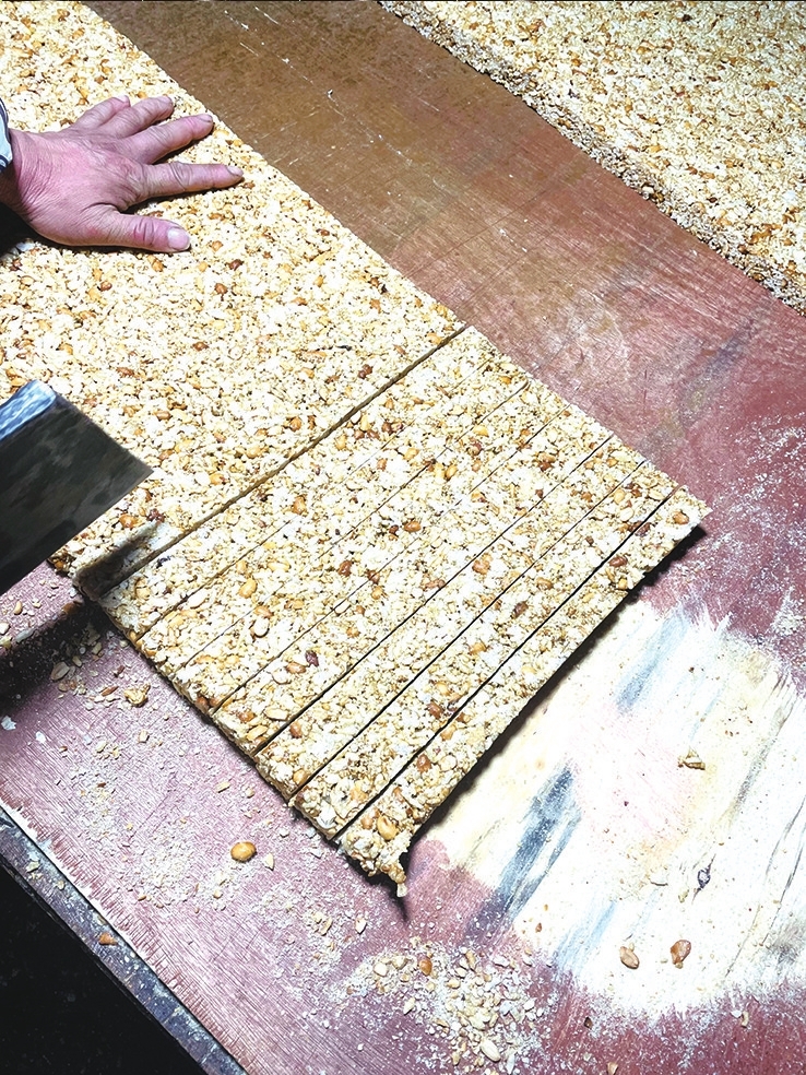 糖混着米胖等食材一起起锅,倒进糖匣,推平,用小木棍把四角戳实,再用糖擂迅速地沿四边、中间,来回碾实,平整了、紧实了,趁着糖还有一点微热,马上脱匣切糖。