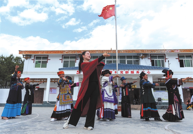 这两天,在四川省普格县德育村,来自宁海县文化馆的舞蹈老师葛爱琴正在指导德育村村民,排练《阿诗且》《达体舞》等彝族特有的传统歌舞。