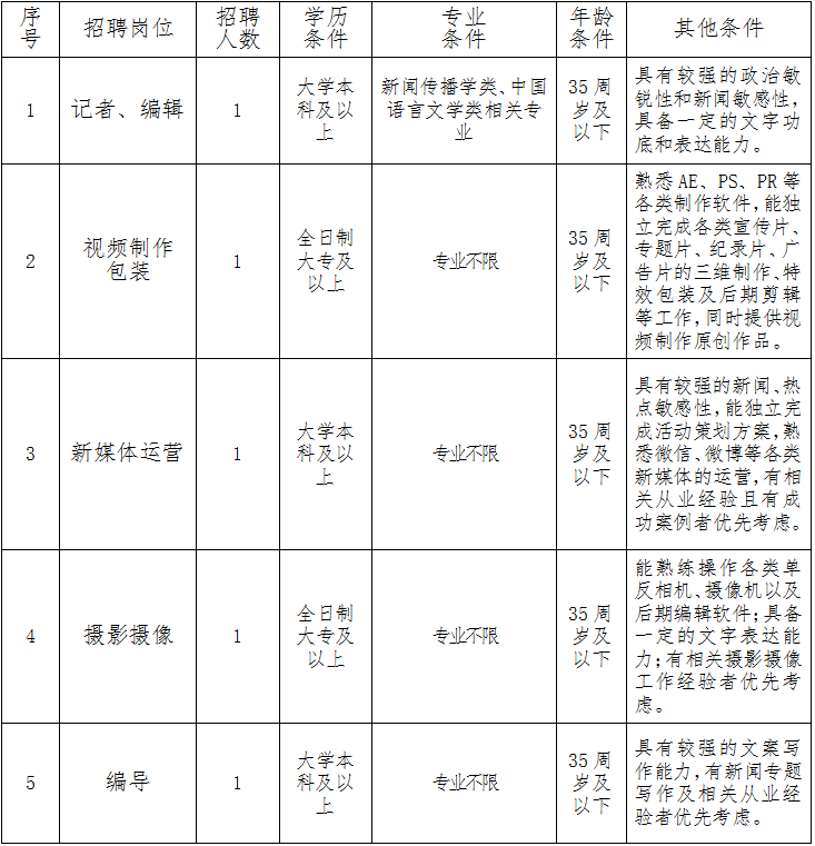 因工作需要,宁海传媒集团(宁海县广播电视台)下属传媒文化有限公司拟面向社会公开招聘工作人员5名,具体事项公告如下: