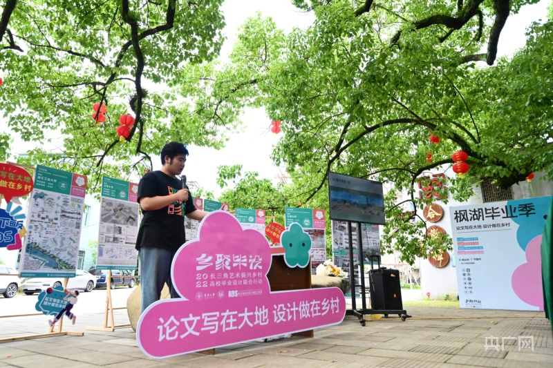 毕业生作品展示(央广网发 通讯员供图) “学生们毕业设计的选题总体来说契合乡村振兴的一些具体要求。比如有针对儿童的空间设计,有针对游客而推出的养生宴等。”作为“我在枫湖做毕设”——长三角艺术振兴乡村高校毕业设计联合行动的主要发起人之一、东华大学服装与艺术设计学院教授陈庆军表示,与其他毕业设计不同,“我在枫湖做毕设”探索村民导师+高校导师+企业导师,从学术探究、商业价值、方案落地等角度,针对方案提出具体问题和建议,从而达到从单纯的毕业设计到项目落地的转变。
