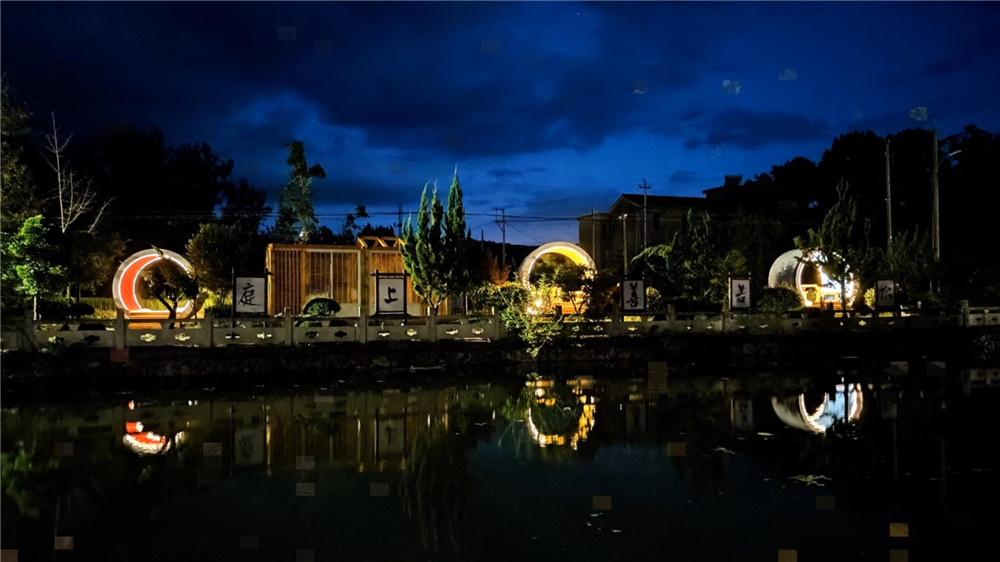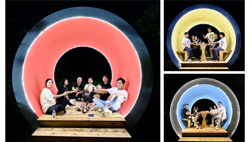 位于湖头村村口的枫湖夜市,是一个大型的公共平台、一个木构空间,红、黄、蓝三色的圆形景观坐具错落有致地散布其间。场地可同时容纳百余名游客,并能满足多元化的社交需求。公共平台可承包团建、旅游等大型社交活动。夜市旁的稻田里,放置了网红装饰,吸引游客打卡。这个大型艺术“试验”,让这个距离宁海城区15公里的宁静村庄,也走上了开发夜市项目、发展“夜经济”的乡村振兴新路径。