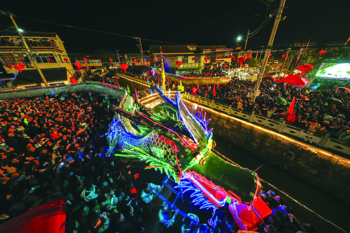 对宁海西岙村的村民来说,春节是“小年”,正月十八才是“大年”。2月8日晚,西岙村张灯结彩,已有750多年历史的“行大龙”仪式在该村如期举行。长39米和32米的一青一黄两龙,由80多名青年壮汉抬着在村庄游走。“行大龙”寄托着村民们的祈盼和祝愿,祈求风调雨顺、吉祥平安,也激励后代子孙积极进取、奋发向上。
