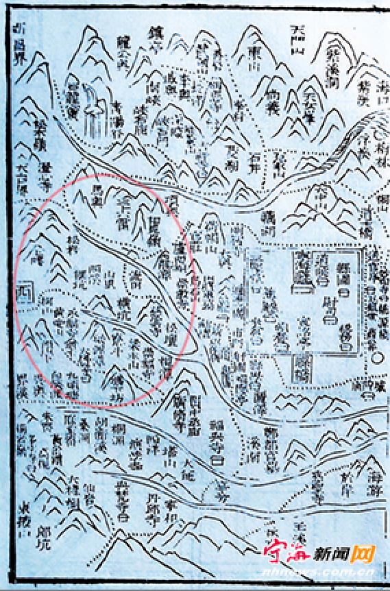 南宋《嘉定赤城志》宁海地图(西部),圆圈内为桐柏山大致范围。