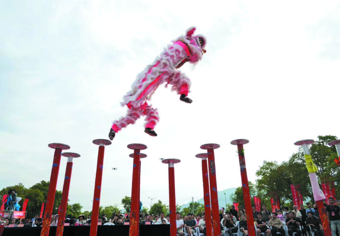 台州学院舞狮队已经是第三次前来参赛,此次,他们主要角逐的是舞狮传统创意项目。舞台上,队员们干净利落的翻腾动作一亮相,就赢得现场观众的阵阵掌声。只见舞狮队员手持道具,用柔顺、灵巧的步法把威武霸气的狮子愕、怕、喜、爬等动作表现得惟妙惟肖。“前童古镇龙狮文化氛围非常浓厚,能和那么多队伍同台竞技,感觉非常棒!”台州学院舞狮队方雨浩说,此次争霸赛,不仅是一场技艺的较量,更是一次文化的交流与传承。