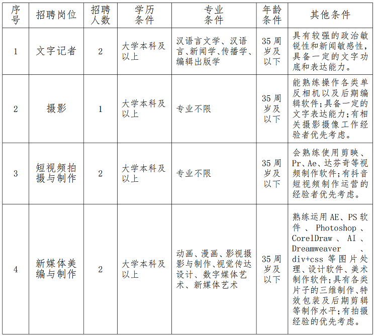 因工作需要,宁海传媒集团(宁海县广播电视台)下属传媒文化有限公司拟面向社会公开招聘工作人员7名,具体事项公告如下: