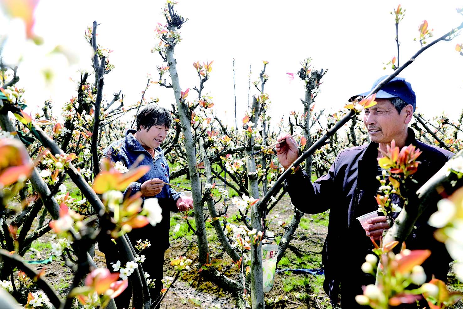 昨日上午,在长街洋湖村全国优质翠冠梨基地,果农在为梨花人工授粉。时下,该村1200多亩成片的翠冠梨已进入盛花期,果农抢抓梨树管护最佳时节忙着为梨花进行人工授粉,提高果树坐果率,为丰产丰收打好基础。