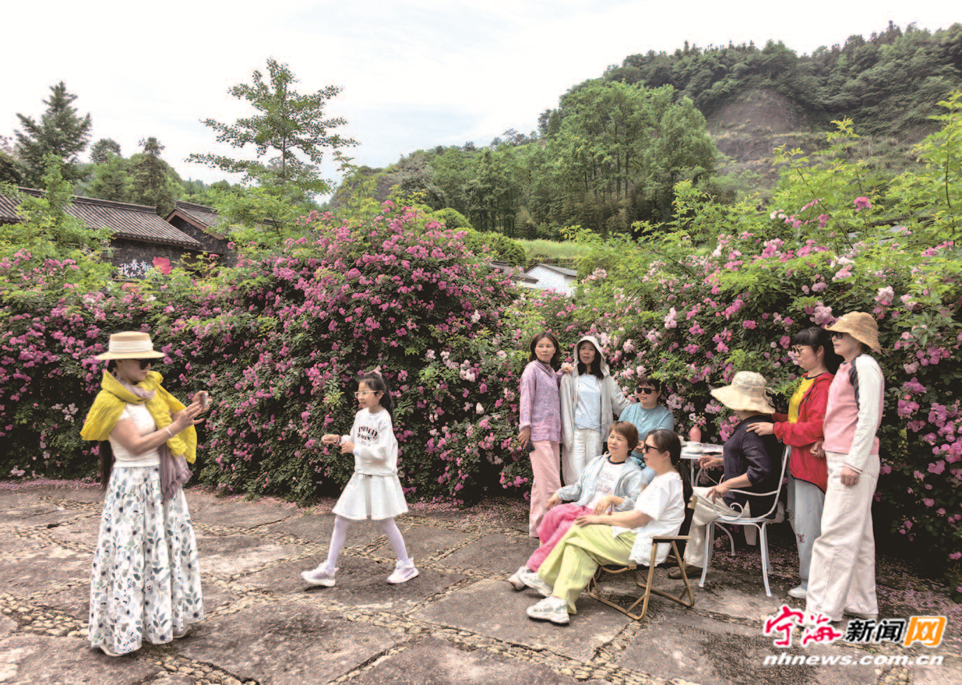 “五一”小长假期间,宁海乡村热闹非凡,景区景点游人如织、民宿一房难求,突显了近年来我县农文旅融合带来的成效。图为游客正在桑洲花源里民宿的蔷薇花前拍照打卡。
