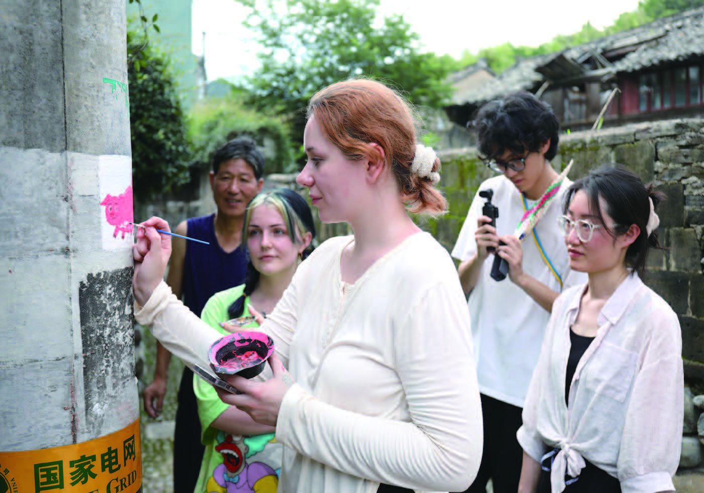 河洪村以深厚文化底蕴和优美自然风光闻名。为了能以全新视角诠释中国传统文化符号,为古村注入开放包容的现代艺术气息,村文化特派员积极牵线,促成了此次艺术创作。记者在村中看到,两位画家专注地在墙上勾勒线条。“我想把生肖的灵动与古村的韵味结合起来。”赫芮蒂娜·狄安娜一边调配着颜料,一边笑着说道。达丽雅·亚舒克也补充道:“希望这些墙绘能成为大家眼中独特的风景。”她们计划绘制十二幅生肖主题墙绘,让象征中国古老智慧的鼠、牛、虎、兔等生肖,以新奇独特的视觉风格,出现在房前屋后、转角小巷。