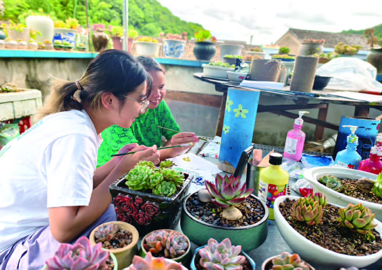 仔细考察后,团队发现张利珍的多肉虽多,但摆放较为杂乱,缺乏展示性。经过双方反复讨论,她们决定用空心砖搭建一面多功能展示墙,既便于归置多肉,又能提升观赏性。为了增强设计感,团队还在砖块一侧手绘了多肉图案。令人意外的是,原本在一旁观望的张利珍竟主动拿起画笔加入创作。“张阿姨画画非常稳,线条干净利落,完全不像新手。”徐日倩赞叹道。在团队的鼓励下,张利珍创作了多幅多肉主题插画。这些作品被涂上防水颜料,错落摆放在庭院中,为小院增添了浓厚的艺术氛围。除了庭院改造,团队还帮助张利珍开发多肉文创产品,设计制作了多肉挂件等小物件,并拍摄产品照片和宣传视频。