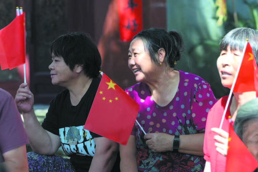 昨日上午,在岔路镇下畈村,村民们手持鲜艳的小红旗,坐在古樟树的浓荫下,通过大屏幕观看阅兵式盛况,脸上洋溢着自豪的笑容,为祖国骄傲点赞。