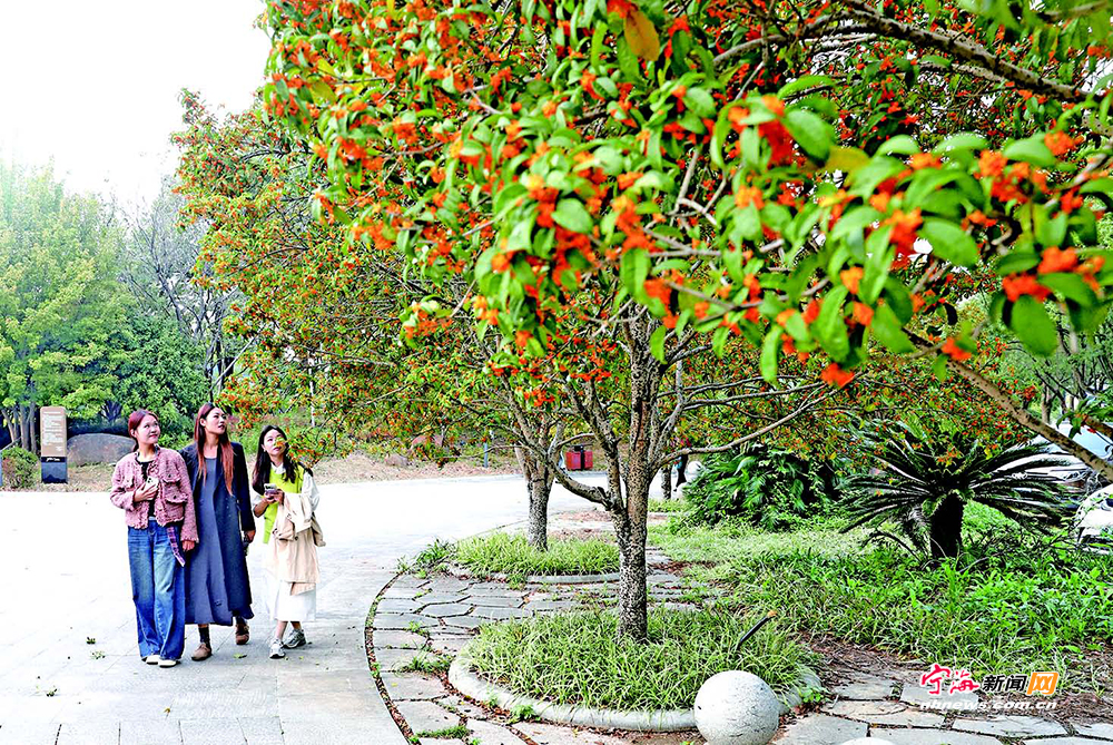 近段时间,宁海街头、公园、小区,桂花纷纷开放,空气中到处弥漫着醉人的桂花香。由于天气等原因,今年桂花开得特别迟,往年在中秋节前后就进入盛花期,今年推迟了一个月才陆续开放。图为市民在天明湖公园赏桂。