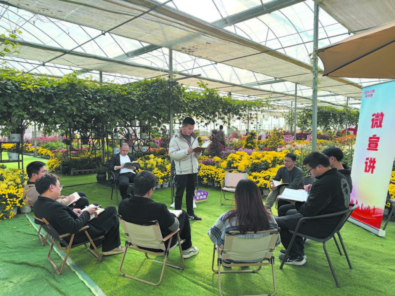 “全会强调要坚持农业农村优先发展,全面推进乡村振兴……”青年宣讲员王羽歌在菊丛旁分享了对全会精神的理解。随后,成员们围绕产业扶持、电商销售等实际问题展开交流。不同于传统的会议室宣讲,这场“花田课堂”打破了空间限制,让理论宣讲更接地气、更贴近生活。