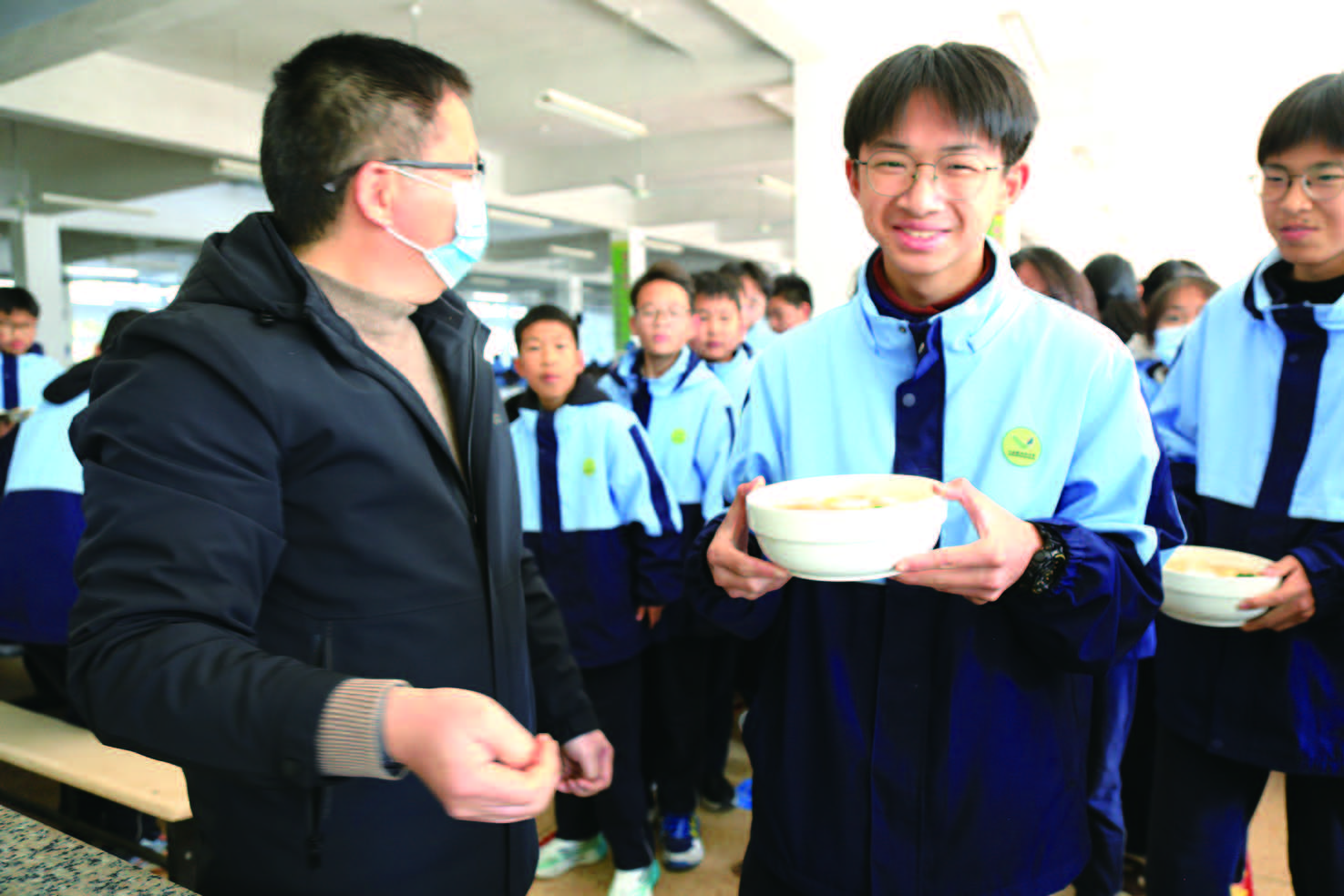 筋道的面条、青翠的时蔬、鲜嫩饱满的对虾……热气腾腾的“生日面”受到了学生们的热烈欢迎。“传统长寿面讲究圆满,我们加一点‘鲜’,寓意孩子们的未来更鲜活、更精彩。”食堂师傅介绍。第一位品尝到“生日面”的是711班的王宸轩,他激动地说:“面很香,汤热乎乎的,感觉这个冬天的寒意都被这碗面赶跑了。”为确保每位寿星都能吃到热乎乎的生日面,学校食堂采取了分时段制作的暖心安排——提前统计就餐时间,在下课前分批下锅,保证面条出锅即享。这看似细微的调整,却让每碗生日面都锁住了最新鲜的温度和最用心的祝福。对于生日恰好在寒暑假的同学,学校也会在学期末为他们提前送上这份祝福。
