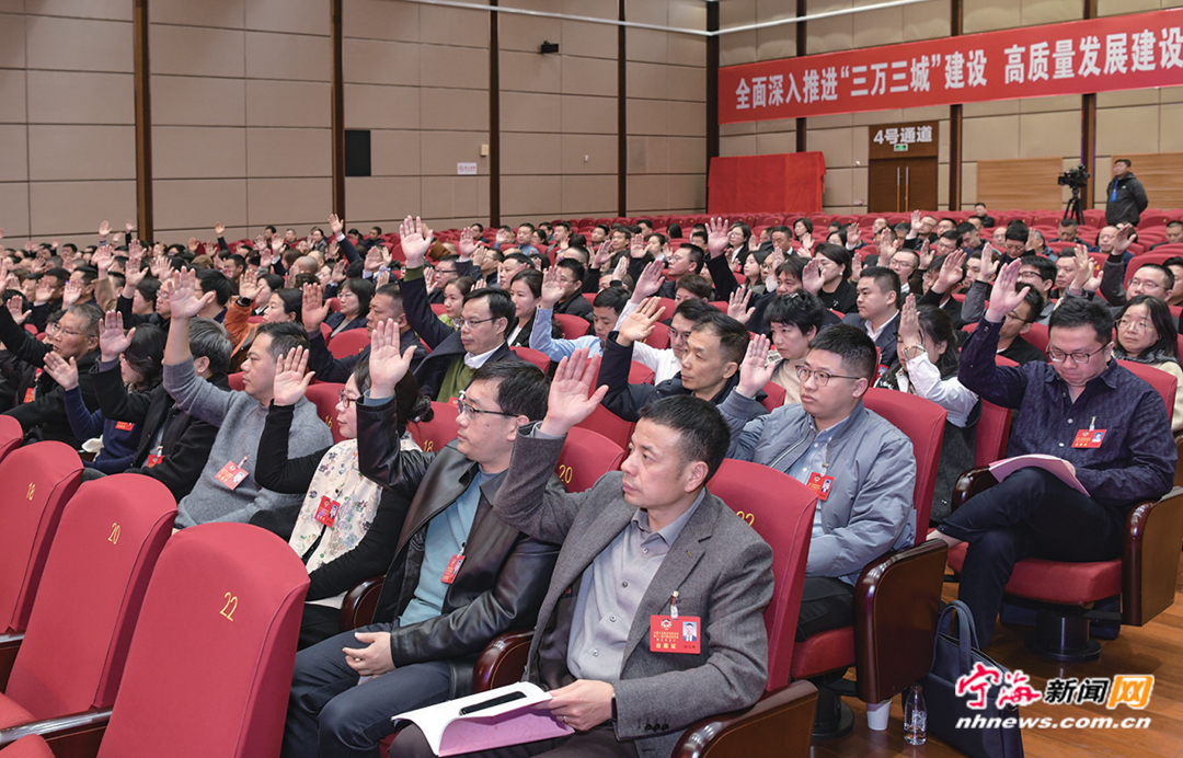 图为政协委员举手表决通过政协全会提案。