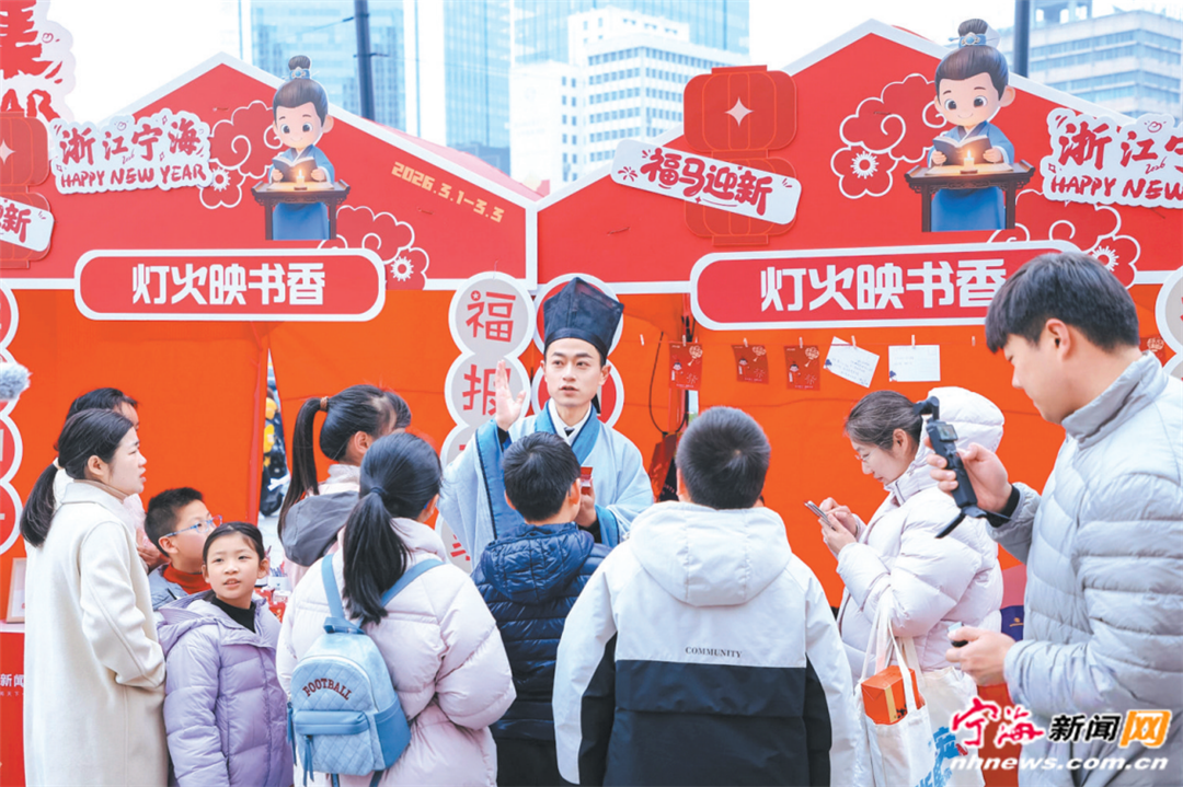 昨日,杭州武林商圈人头攒动,由潮新闻主办的“潮IN武林·福报万家”2026元宵游园会热闹举行。宁海传媒集团打造的“读书种子福报万家”主题“灯火映书香”特色展位,吸引不少市民驻足围观、打卡体验,成为游园会上一道兼具书香与年味的特色风景线。