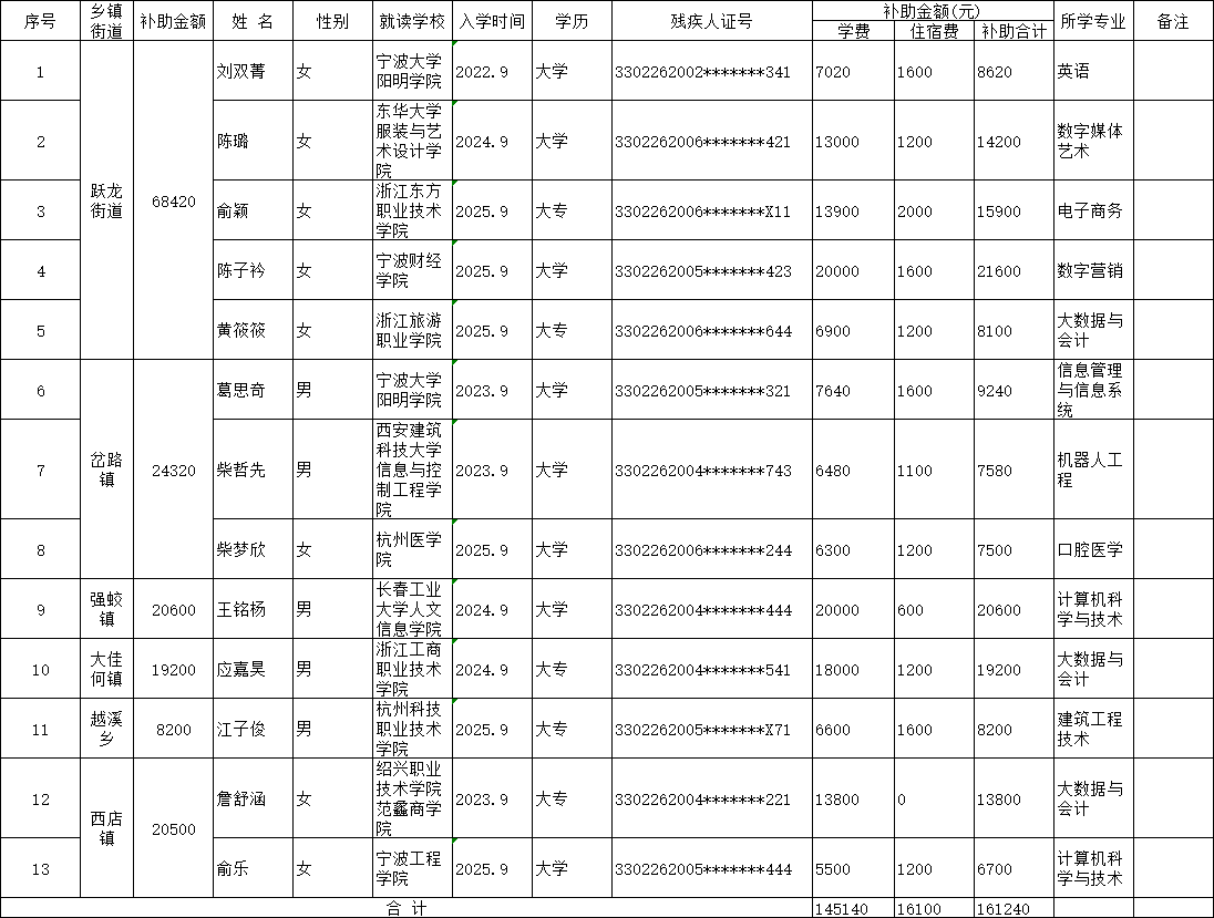 - 2025-2026年残疾人大学生免除学费住宿费汇总情况公示