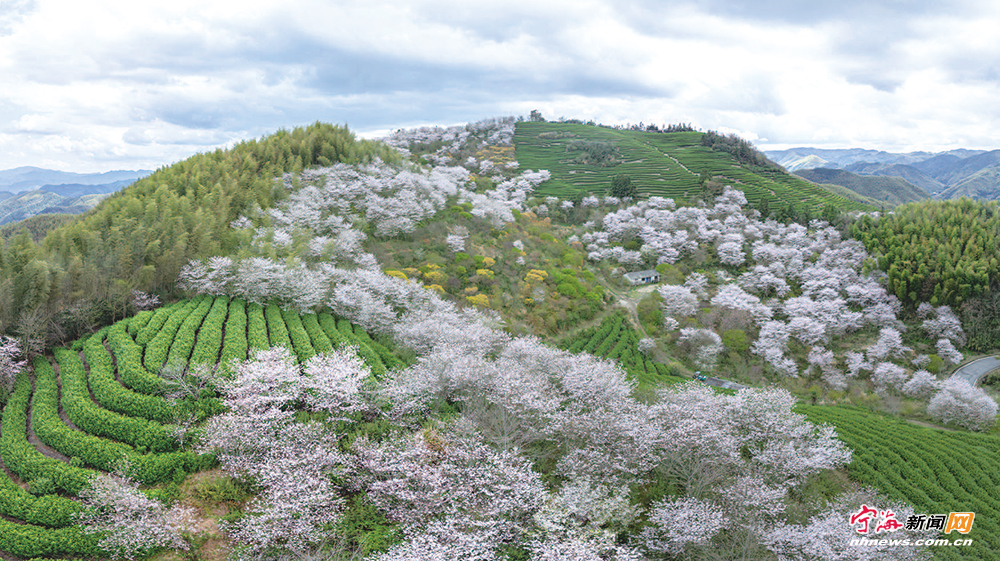 连日来,深甽镇陈家坑村七星茶场迎来一年中最美的时节。数千株野生樱花在层层叠叠的茶园间肆意绽放,粉白如雪的花浪漫过山野,与翠绿的茶园、连绵的青山相映成趣,构成一幅绝美的春日画卷。