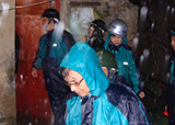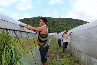 | 越溪乡绿色城堡蔬菜种植专业合作社的社员正在掀起大棚薄膜,以防台风损坏。