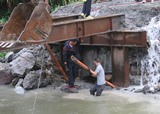 一是加固底桩,即在主要受力桩处各加一套底桩,将2米左右长的竹桩(或铁管)打入海底,用绳索绑住渔排。一般一个渔排前后各加套桩,左右各加2套桩;二是加固木板,对部分老化的木板进行加固(可用毛竹绑在老化的木板上进行加固)或更新;三是串联绳索,即除加底桩绳索外,用绳索将每个网箱一个一个串联起来,前后左右均用绳索串联起来,这样即使网箱木板折断,整排也不散掉;四是加固网盖,即用网将网箱向上的开口封住,一个网箱一张网,用网线将网盖与网箱缝成一体,以防止网箱内养殖物被风浪打到箱外。