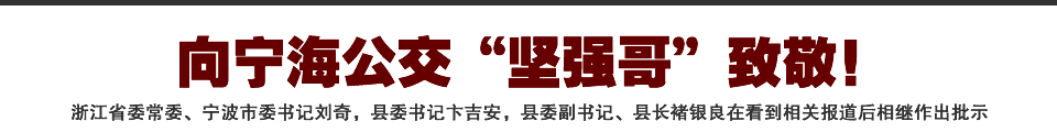 | 8月23日,《今日宁海》和“i视宁海”率先以消息和视频的形式推出《宁海公交“坚强哥”忍痛停车守护乘客安全》的报道,立即引起了社会各界的广泛关注。8月26日,省委常委、宁波市委书记刘奇,县委书记卞吉安,县委副书记、县长褚银良在看到相关报道后相继作出批示。刘奇在批示中指出,王震忘我、无畏、敬业的精神令人敬佩,要大力宣传。